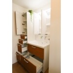 洗面台の隣に幅30cmの収納棚を設置しました。 高さを有効活用できるようになり、大幅に収納量がアップしました。 扉材は洗面台と同じです。
