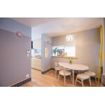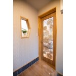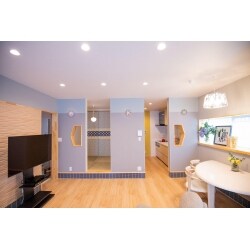 階段を回り階段とし浴室、脱衣室を1坪サイズに、元々和室だったスペースにキッチンと奥様の小部屋を配置。リビングの一角にワンちゃんコーナーを設けて床全体にコーティングをしました。和室の小上がりの高さで鮮やかなブルーのタイルをリビング全体に張りアクセントとしています。またリビングの壁にトルコの鍋敷きを照明に改造して取付。奥様といつもネイルを見せ合いっこしていたのですが、そのネイルからのインスピレーションでレースのドアをオリジナルで作りました。