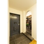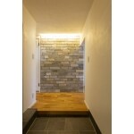 玄関の背面の壁には天然石を施し、間接照明を用いることでさらに高級感・重厚感を演出。