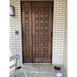 剥離剤を使用して元の塗装をしっかり落としてから木目の残る塗装で仕上げました。丁番部分もきれいに塗装しました。