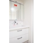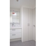 3面鏡タイプのLIXILピアラですっきり収納ができ、化粧台隣にも収納スペースを設けました。 収納棚は南海プライウッドの可動棚を採用し、収納するものによって高さを調整することが可能であることがポイントです。