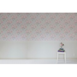 グレーベースのピンクの花柄が大人っぽいローラアシュレイの壁紙をアクセントに、腰高さまでの白の木目調クロスとトリムをプラス。 かわいらしさと洗練された女性らしさが融合した大人フェミニンな仕上がりです。 床は塩ビタイルです。