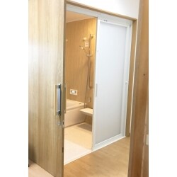 お風呂の入り口は出入りしやすく、スペースを取らない引戸をご提案。手すりも2ヶ所に設置のうえ、手すりとして使用できるシャワーハンガーも設置させていただきました。 タイルのお風呂に比べると断熱性がかなりあがり、浴室暖房機もお付けしたことで暖かく快適に過ごしていただけると思います。窓も2重サッシに取り替えているので、ひんやりした空気が入ってこないです。 色も完全にお任せいただいたので、暖かくみえるお色をご提案しました。