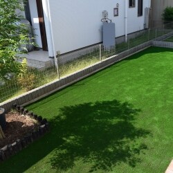 人工芝の種類は沢山あるため、ご自宅で実際のサンプルをお見せしながらご提案。 ワンちゃんとお子様がいらっしゃるお施主様の“お庭の過ごし方”に合う商品を選びました。 またお庭全体を人工芝にするのではなく、レンガで仕切ることでコストカット。 仕切った箇所はご自身で砂利を敷いたりフェンスを付けたりとDIYが楽しめるスペースにしました。