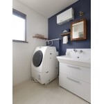 明るい洗面スペースへ。床はフローリングにし、掃除も簡単に。