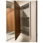 ・洗面台を広くしたい。 ・扉が内開きで、開けた際に棚が使えなくなってしまうので、折れ戸などにしたい。