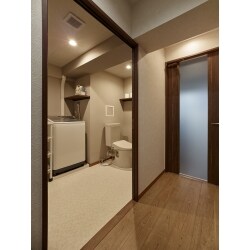 壁を取り払い、トイレと脱衣スペースを一体化。さらに洗面を廊下に設置し、トイレ空間を広く使用できます。