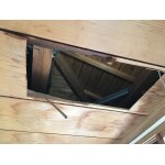 (旧積和建設西東京株式会社での事例です。)急ぎ現場に向かい、天井開口と水かけによる雨漏り調査を行いました。屋根材の隙間から水が漏れていた為、コーキングによる処置と、内装については天井板が水濡れで傷んだため、開口部補修とクロス上貼りにて補修いたしました。