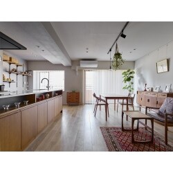 施主様のこだわりを最大限実現できるよう計画しました。北欧ヴィンテージ風の空間がお好きで、いろいろな家具を集められていました。家具が映えるような明るい色合いの無垢材やタイルを組み合わせてご提案。それぞれの部屋ごとにテイストを分け、クロスを張り分けるなど、遊びのあるリフォームにしました。