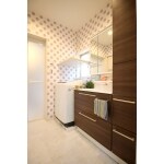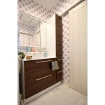 落ち着いた色合いの洗面化粧台ですが、ドットのクロスとあわせることで、とってもキュートな雰囲気の洗面室に仕上げました。