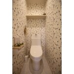 暖かな色味で、落ち着く雰囲気のトイレです。抑えめの色合いの草花模様クロスがとってもキュートです!