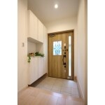 ホワイト基調の木目シューズボックスに、アイアン飾りつきの木目玄関ドアがとてもかわいらしい、明るい雰囲気の玄関です。