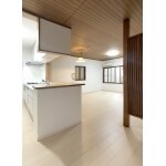 キッチン入口の垂れ壁の撤去と、カウンター上部の垂れ壁を縮め、キッチンの採光を広げるプラン。 キッチン床の沈みはしっかりと補強し、LD側までフロアタイルを上張りして一体感を出すことをご提案しました。