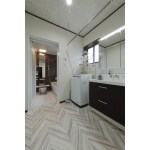 タイル貼りからクロス仕上げに変更、お掃除しやすくおしゃれになりました。 ヘリンボーン模様の床がポイントです。