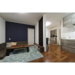 濃紺の和紙風クロスとインテリア格子がポイント。 空間が引き締まって見えます。