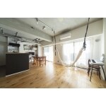 天井、洗面所の壁をモルタル仕上げにし、リビングドア以外の建具はすべて白に統一。 キッチン腰壁の黒がアクセントになり、白・黒・モルタルでとてもお洒落でスッキリとした空間が出来ました。 構造用合板・シナ材等の木材を使用して、大容量の玄関収納や洗面造作棚など、さまざまな棚板を造作しています。 室内物干しがとても便利そう。 洋室窓には結露対策の為、断熱材入り壁造作・二重窓を採用。 リビングのハンモックは、お子様たちにも喜ばれますね。