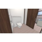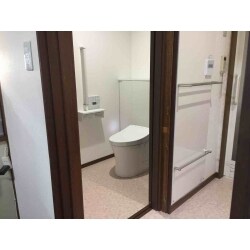 根本的な使いやすさを考え、階段下の収納スペースを拡張して トイレ空間を広げるという提案をしました。 こうすることで、トイレのみならず、水回り導線の全てが回遊でき、 生活導線が短くなることで利便性をUPさせることが出来ました。 トイレ空間は当初の計画通りの1坪確保でき、 同時に段差解消や開き戸から引き戸への変更で 水回り導線の全てをバリアフリー化させることができました。 また、トイレ空間は将来的な介護を考え設計しました。 トイレの機能としては、自動洗浄&自動開閉機能付きの TOTOのレストパルを採用しました。 もちろん、トイレ室内には手摺りが設置されています。 照明はLEDの人感センサーに変更し、換気扇連動スイッチにしました。