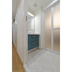 浴室を拡げたので、間仕切り壁を新しく作り直して内装を一新しました。 三面鏡・フルスライド収納の使いやすい洗面化粧台を取り付けました。北欧ブルーのかわいいカラーがアクセント。
