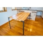 奥にあるキッチンの作り付けの棚とお揃いのダイニングテーブルを手作りしました。統一感がありすっきりして見えます。