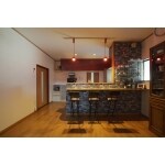 対面キッチンに変更して、前面にレンガ柄のクロスを貼りました。 お酒好きなご主人の晩酌スペースに。