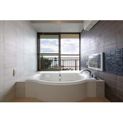 ジェットバス付きの大きなバスタブ、浴室テレビ、浴室暖房を備えたラグジュアリーなバスルームに。 景色を眺めながらゆっくりバスタイムを愉しめます。