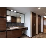 洗面脱衣スペースにあるトイレを撤去して、ゆったりと使える洗面カウンターと、収納スペースを設けました。 ホテルのような高級感漂う人造大理石のワイドカウンターや、アクセントに浴室とお揃いのタイルを貼り、空間に繋がりを持たせました。