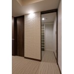 寝室の収納スペースの一部を玄関収納に充てて、シューズインクロークを設けました。 また、アクセントウォールには消臭・調湿効果のあるエコカラットを貼りました。 玄関に立った時の見た目のバランスを取るため、エコカラットの壁と左右対称になるように扉の反対側に扉風のパネルを設置しています。