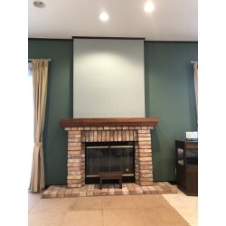 アースカラーのグリーンの濃淡のアクセントクロスが、既存の暖炉生まれ変わらせ、さらにぬくもりのある居心地の良い空間に。