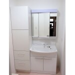 洗面化粧台にPanasonicエムラインをご提案させていただきました。割れにくい洗面ボールとミラー裏に収納できる三面鏡があり使いやすくなりました。 化粧台横の隙間にLIXILピアラのトールキャビネットを設置して収納力をアップしました。