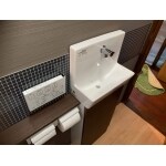 トイレ床のバリアフリーへ。手洗い器とカウンターの設置 アクセントパネルを設置しお洒落なトイレ空間に