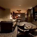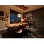 古材を天井に取り付け梁のように見せ、そこからダウンライトとPH5の照明を取り付けました。古材の重量がありますので中をくりぬいて軽量化し、天吊りにしています。リビングの窓枠にはセラミック材を使い耐久性、インテリア性を高め、一部をカウンターにしてバーコーナーにしました。セラミックの加工を曲線ラインにうまく合わせる工夫をしています。壁に絵をかけたいとのことでしたが、壁面が少ないためドア枠のないドアにすることにより壁面として仕上げました。さらにポーターズペイントでインパクトのある壁に仕上げています。古材の耳を生かした手洗カウンターも工夫して取り付けました。