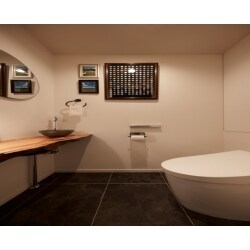 古材を天井に取り付け梁のように見せ、そこからダウンライトとPH5の照明を取り付けました。古材の重量がありますので中をくりぬいて軽量化し、天吊りにしています。リビングの窓枠にはセラミック材を使い耐久性、インテリア性を高め、一部をカウンターにしてバーコーナーにしました。セラミックの加工を曲線ラインにうまく合わせる工夫をしています。壁に絵をかけたいとのことでしたが、壁面が少ないためドア枠のないドアにすることにより壁面として仕上げました。さらにポーターズペイントでインパクトのある壁に仕上げています。古材の耳を生かした手洗カウンターも工夫して取り付けました。