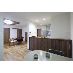 お母様の寝室以外は間仕切りをなくし広々と使えるLDKにし、収納を一か所にまとめたパントリーをキッチン裏に設けました。構造上撤去できなかった柱は袖壁とし、廊下から入ってきて正面にあるキッチンの目隠しとしました。サッシ、床暖房の計画により、温熱環境を向上させています。
