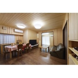 無垢材を壁・天井に貼って、木に包まれているような空間に仕上げました。 床は生活の中でキズ・汚れが付きやすいので、通常のフローリングにすることをご提案させていただきました。