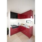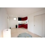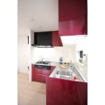 ホワイト基調のお部屋に、キレイな赤いキッチンをチョイス。 換気扇の色をブラックにすることで、カッコよさをプラスしました。