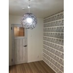 ご主人様の寝室。こちらも一面だけ、個性的なクロスを選びました。 どちらも、個性的ではあるものの、照明、扉に統一感をだして、落ち着いた寝室になりました。