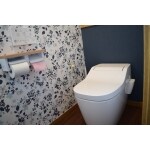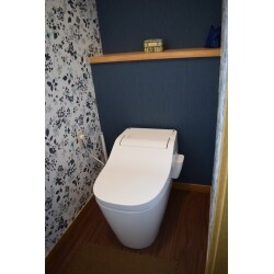 お手入れのしやすさを考慮し、全自動お掃除トイレの「アラウーノ」を採用しました。 またプラスアルファの空間提案としては、内装仕上げに工夫を凝らし、トイレだからこそくつろげる空間になるような演出をしました。