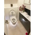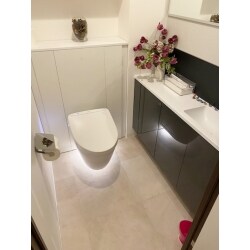 TOTO レストパルF I型まるごと収納タイプにお取替え。 ウォシュレットはアプリコットF3AWタイプです。 レストパルFはやわらかフロアライトを標準装備。 入室すると自動でやわらかフロアライトが点灯、退室すると自動で消灯します。 浮遊感を演出するとともに、部屋に広がり感をもたらします。 手洗い器はレストルームドレッサープレミアムシリーズLサイズにお取替え。 キャビネットは「ルフレダークグレー」をお選び頂きました。 カウンターとボウルがシームレスにつながるスッキリデザイン。 コンパクトながら奥深くまで手を入れやすい形状で水はねしにくく、しっかり手洗いできます。