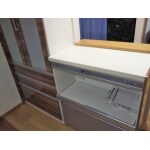 ・当初、キッチンスペースを奥の方に移動して対面にするご希望でしたが、カップボード等の置き場の問題と、窓を2箇所さわるかたちになり、あまり効率的ではなく、結局、既存の位置に付ける事になりました。・リビングドアの吊元側に通柱があり、和室の開口部を確保する為、アウトセットにして2枚連動の引き込み戸を取付ました。