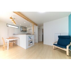 間仕切りを無くし、一体にしたLDKのアクセントカラーはブルーで鮮やかに。