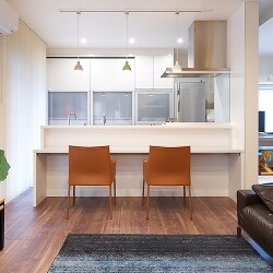奥様の動線を考慮してセンターキッチンプランをご提案。ダイニングと子供部屋を見渡せる位置にキッチンを大移動しました。随所にニッチ収納を設け、お子様の作品や絵本を配置したりスイッチやリモコン関係をまとめる空間として造作しています。窓は内窓を取付し断熱効果もUP。幼い子供達の成長をセンターキッチンから広い視野で見守る巣まいです。