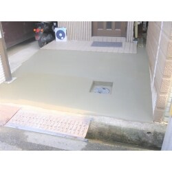 まず、撤去工事としてカッター工、門塀撤去・斫り工。花壇撤去、土間コンクリート撤去。鋤取り工を施し、スロープ土間コンクリートの改修工事で砕石敷均し転圧工、ワイヤーメッシュ筋敷設、刷毛仕上げの土間コンクリート工事を終え完了させていただきました。