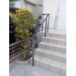 以前の玄関前スペースは、門扉と駐車スペースの間に壁と植栽スペースがありましたが、 その部分を撤去し、広々とした駐車スペースを実現しました。 右側にあった植栽スペースを撤去し、アプローチ階段の手すりLIXIL アーキレールで施工しました。