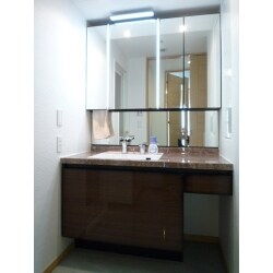 洗面化粧台は高級感がありスタイリッシュな印象のLIXIL ルミシスW1200にお取替え。 扉面材はハイグレードで鏡面仕様が美しい「アンティークブラウン」、 カウンターもハイグレードの「ラピシアネオブラウン」をお選び頂きました。 カウンターはボウル一体タイプで継ぎ目がなくお掃除もラクラクです。 鏡はW900+W300の4面鏡です。 上部にLED照明+鏡には縦型LED照明のフェイスフルライトが組み込まれています。 通常の上からの照明だけですとあごの下や頬に影ができますが、 フェイスフルライトは光が顔全体を照らし、影ができにくくなっています。 また場面に合わせて明るさを3段階で調整ができます。