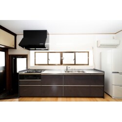 居室の床はすべて下地からのやり替えをご提案しました。 和風の佇まいにマッチするように、無垢フローリング(西南桜塗装済)をセレクト。 やさしい雰囲気の無垢材にキッチンはブラック系をセレクトし、男の一人暮らしならではの辛口コーディネートの完成です。