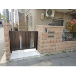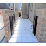 アプローチにコンクリート下地補修後、ニッタイのエルシードでタイル工事を施し、表札・ポスト・ドアホンを二世帯用に新調し、門扉、門灯も取替えました。
