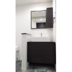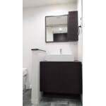 施工後 トイレとの壁を取り払い、トイレと洗面の間に手すりを兼ねた腰壁を設置いたしました。