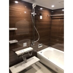 ダークブラウンの木目が高級感のある浴室。 見た目の良さだけではなくキレイ除菌水の床洗浄機能や、スマホから浴槽洗浄・湯はりが可能な快適機能で家事のサポートもしてくれます。