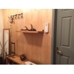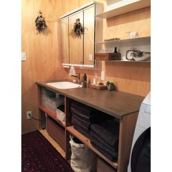 壁1枚を取り除き新たな場所に壁を設け、空間と洗面台を広くすることが可能に。DIYが大好きな奥様が「住みながら自分好みの棚を取付したい」とのことでしたので壁も天井も合板仕上げをご採用いただきました。せっかくなのでスイッチプレートもご提案させていただきました。