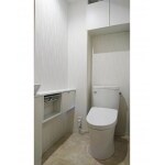 既存の梁と壁を解体しトイレの横幅を広げることにより、お客様からご希望頂いておりました手洗いカウンターを取り付けました。 梁横には横幅に合わせ背面収納を取り付け収納力もUPしました。